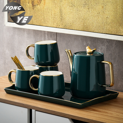 Taza de café de estilo occidental, colador verde con borde dorado, juego creativo simple de seis tazas de té de cerámica