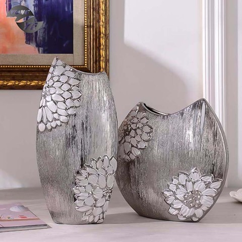 Florero de cerámica moderno de forma plana de decoración de sobremesa artesanal con patrones de flores galvanizadas